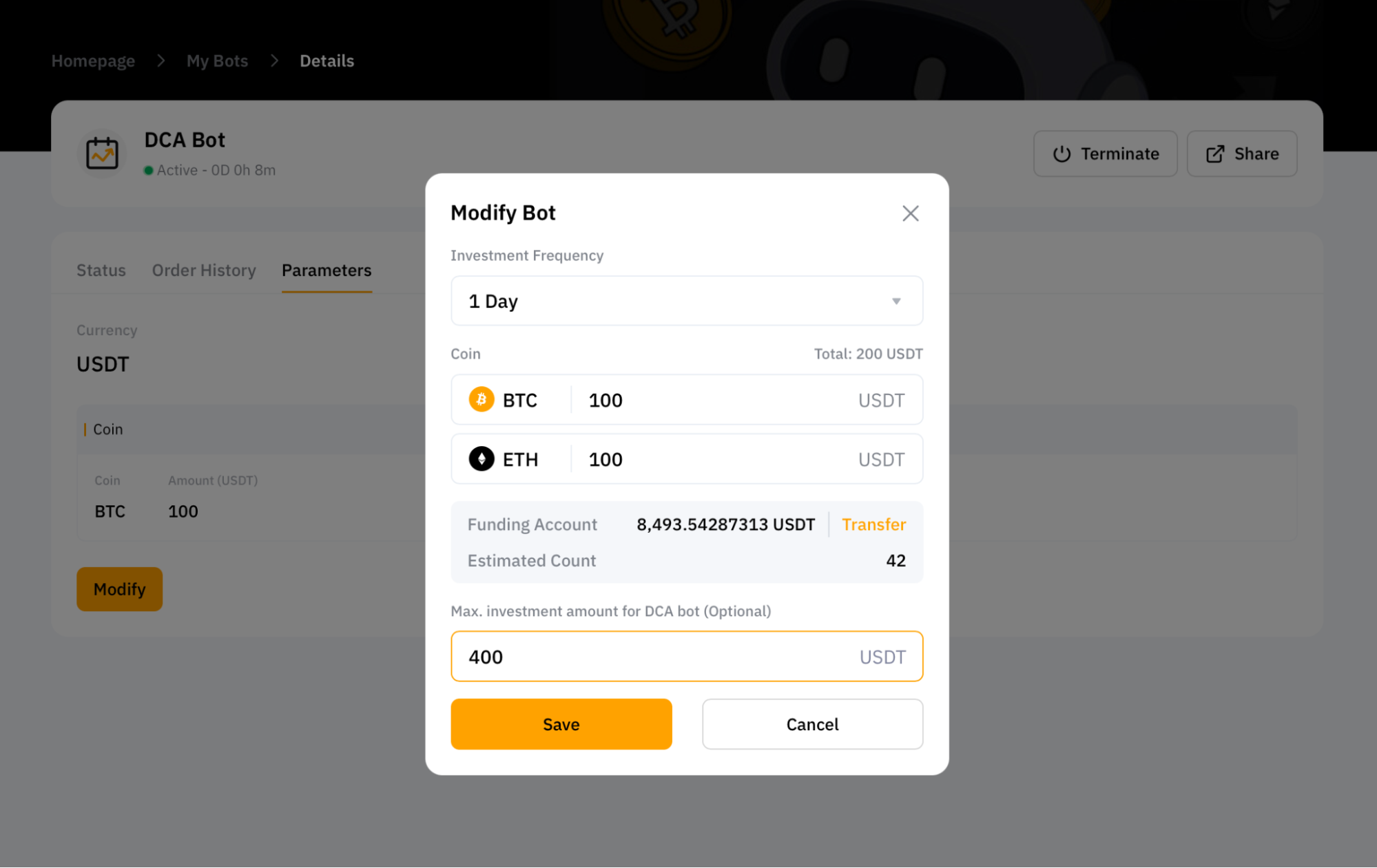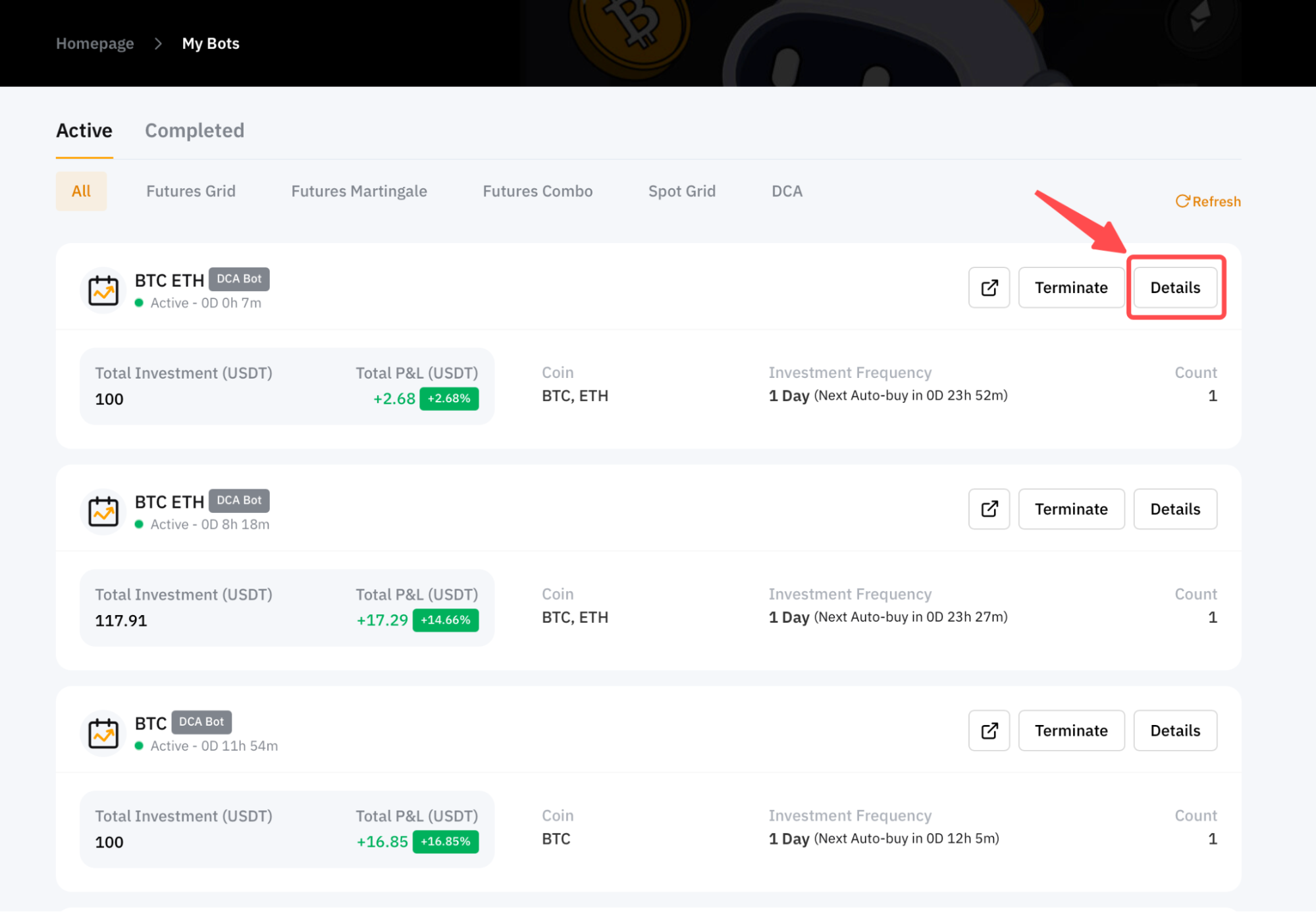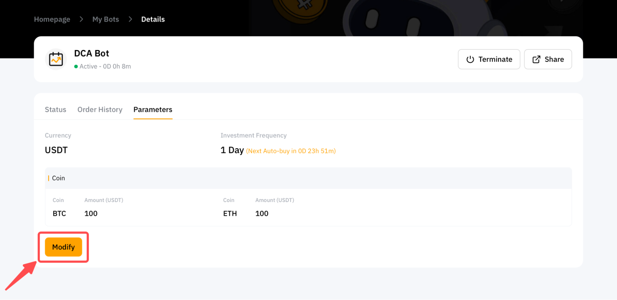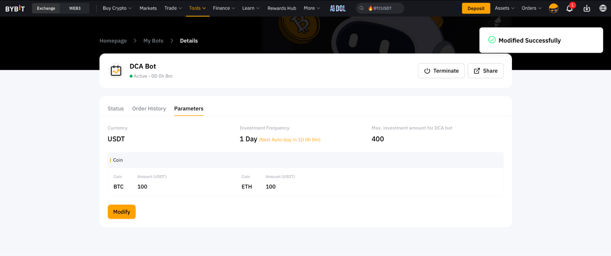 第 1 步:点击 Bybit 交易机器人页面左上角的我的机器人。然后点击 定投 机器人右上角的“详情”,即可修改参数。