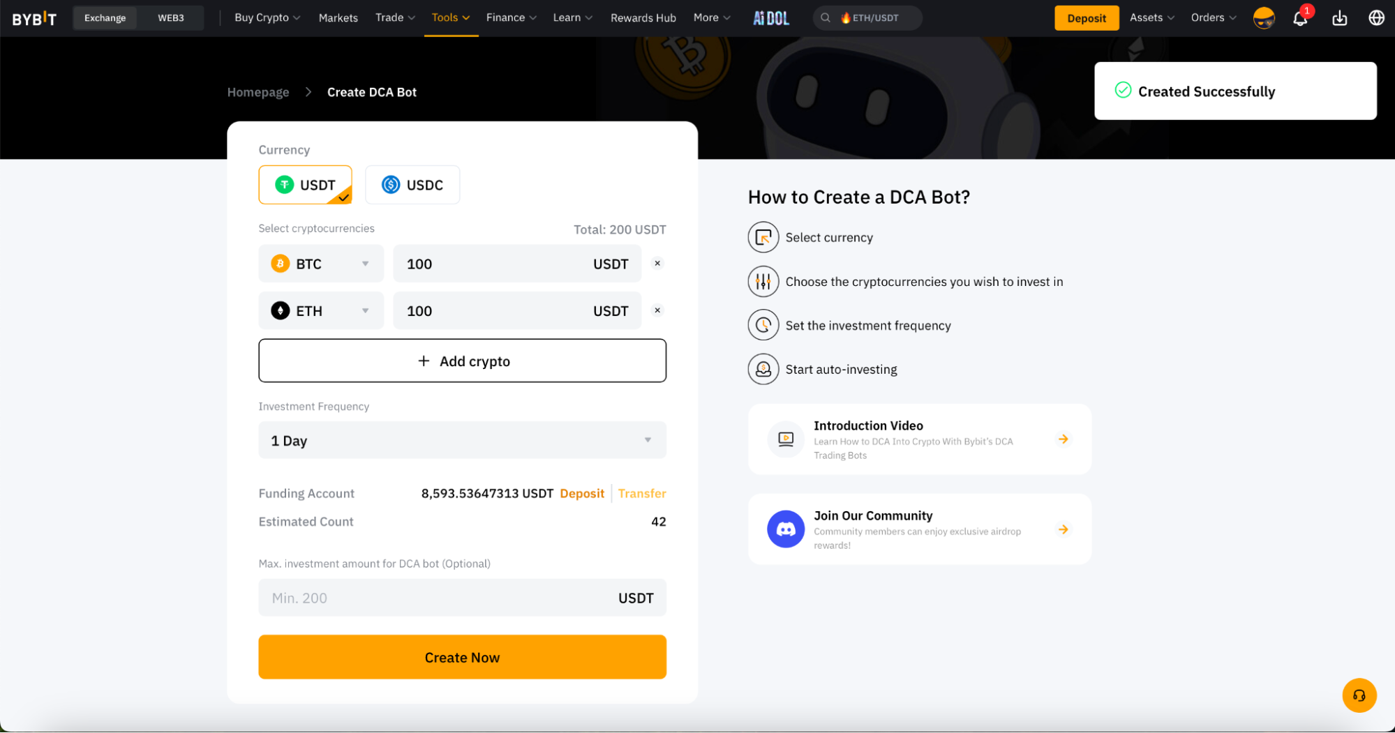 请注意,成功创建 定投 机器人后,即可开启首笔 定投机器人 投资。