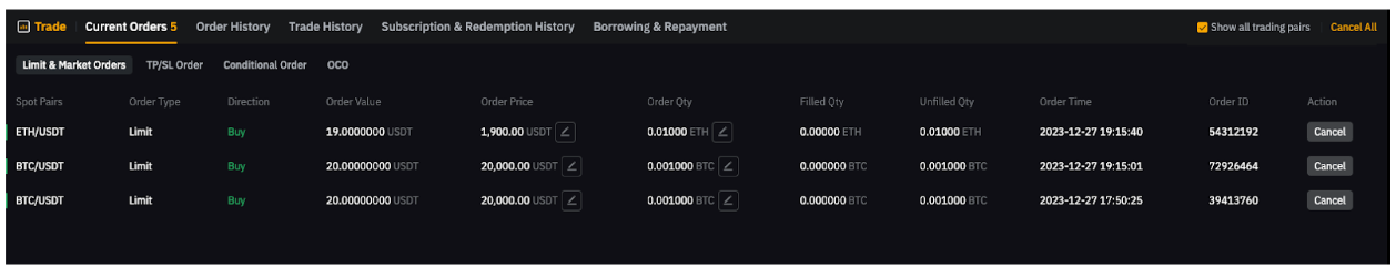 要取消现货订单,前往当前订单选项卡并点击取消即可。或者,您可以从右上角选择取消全部订单。需要注意的是,如果您已经选择了显示全部交易对选项,点击全部取消将会取消所有交易对的订单。