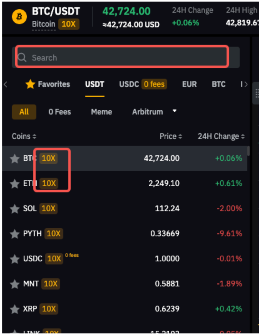 如需快速查找某个交易对,请在搜索框直接输入要查看的交易对。如某个交易对旁边带有“10x”标签,则表示该交易对支持现货杠杆交易。