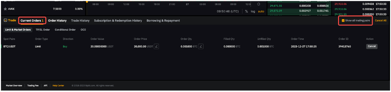 您在当前订单选项卡处即可查看当前未成交或未触发的订单。 如需查看各个交易对的全部当前订单,点击显示全部交易对框即可。