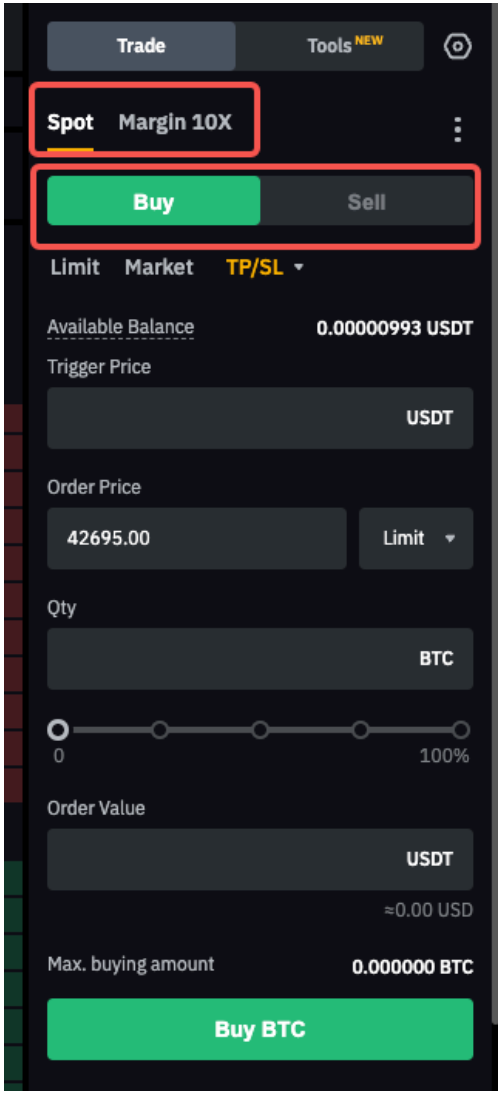 第 1 步:要进行现货交易,请确认您当前已打开现货选项卡。然后,选择买入或卖出资产。
