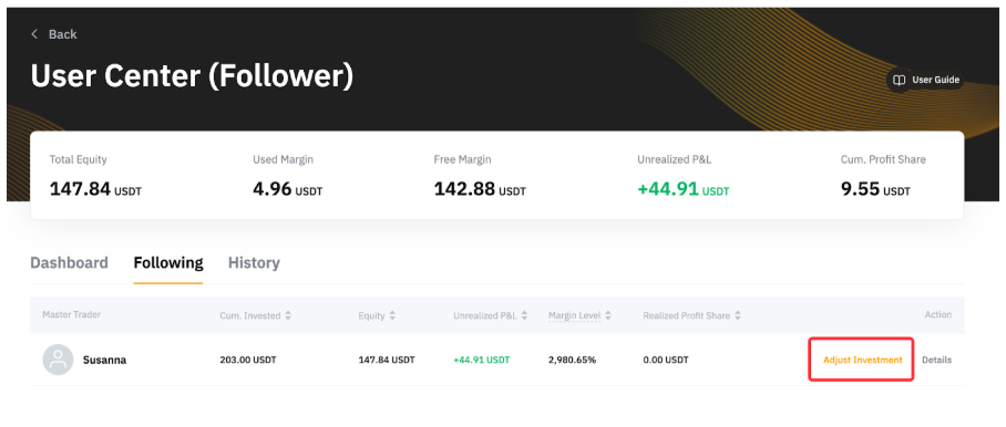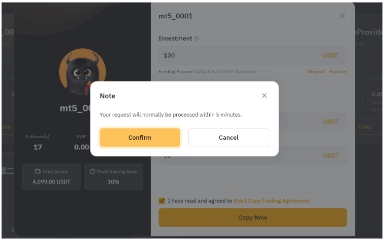投资额:跟单用户的最低投资额为 100 USDx,最高投资额为 1,000,000 USDx。请注意,您的交易达人可以针对最低跟单金额设置更高的要求,该字段中将显示最低金额。