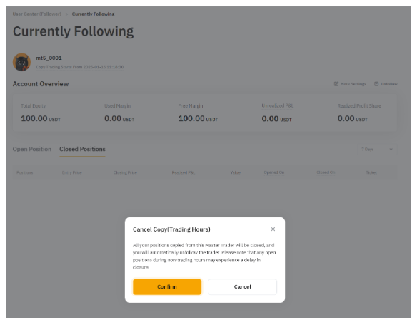 请注意,当您对交易达人取消跟单时,您跟随的所有仓位都将平仓。请注意,非交易时段内仓位的平仓可能出现延迟。