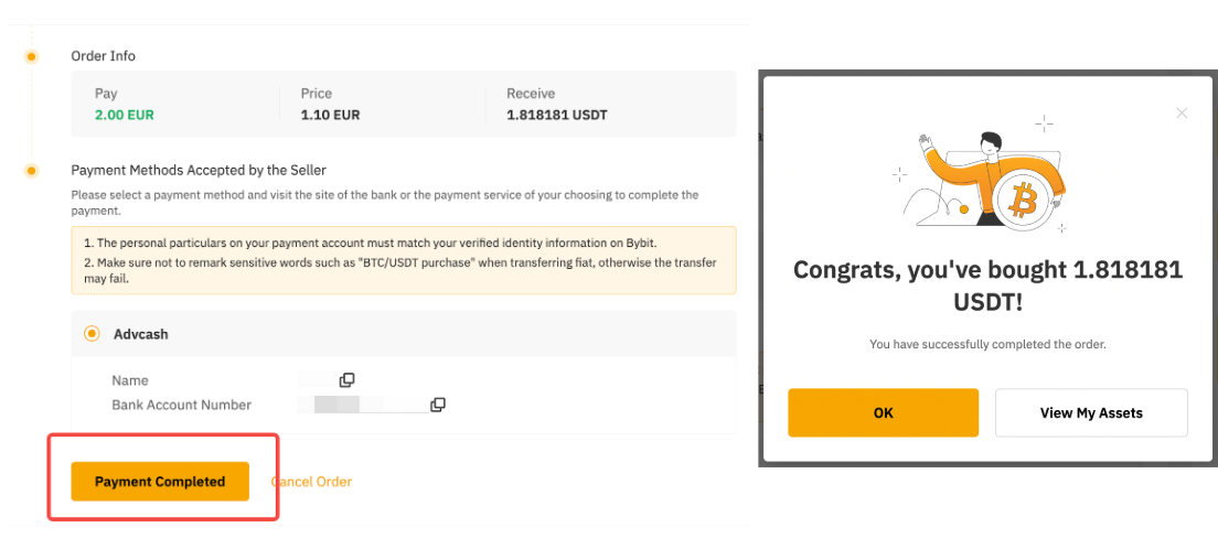 第 4 步: 返回您的 Bybit P2P 订单页面,并在完成付款后单击“付款已完成”。耐心等待广告商处理代币划转。卖家成功向您的资金账户发放您购买的代币后,您可以点击“查看我的资产”进行验证,并附上您的交易历史记录。