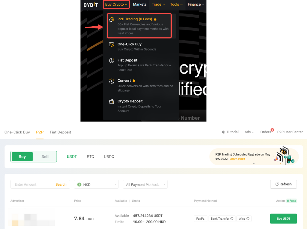 第 1 步:请点击导航栏左上角的快键买币→P2P 交易,进入P2P 交易页面。如果您想购买 USDT,请选择您的首选广告,然后点击买入 USDT