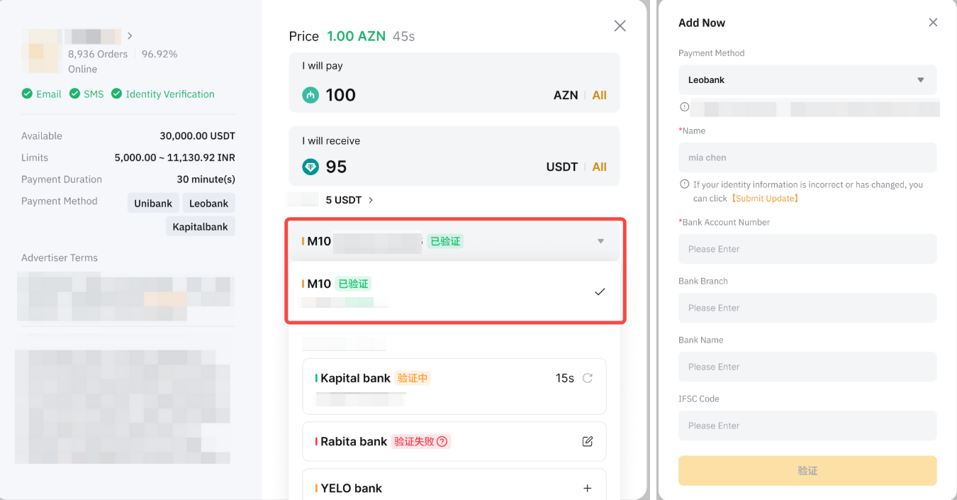 对于涉及个人验证为 AZE 或使用 AZN 货币的用户的交易,需要对您的银行账户信息进行验证。请确保输入将用于接收付款的银行账户详细信息。