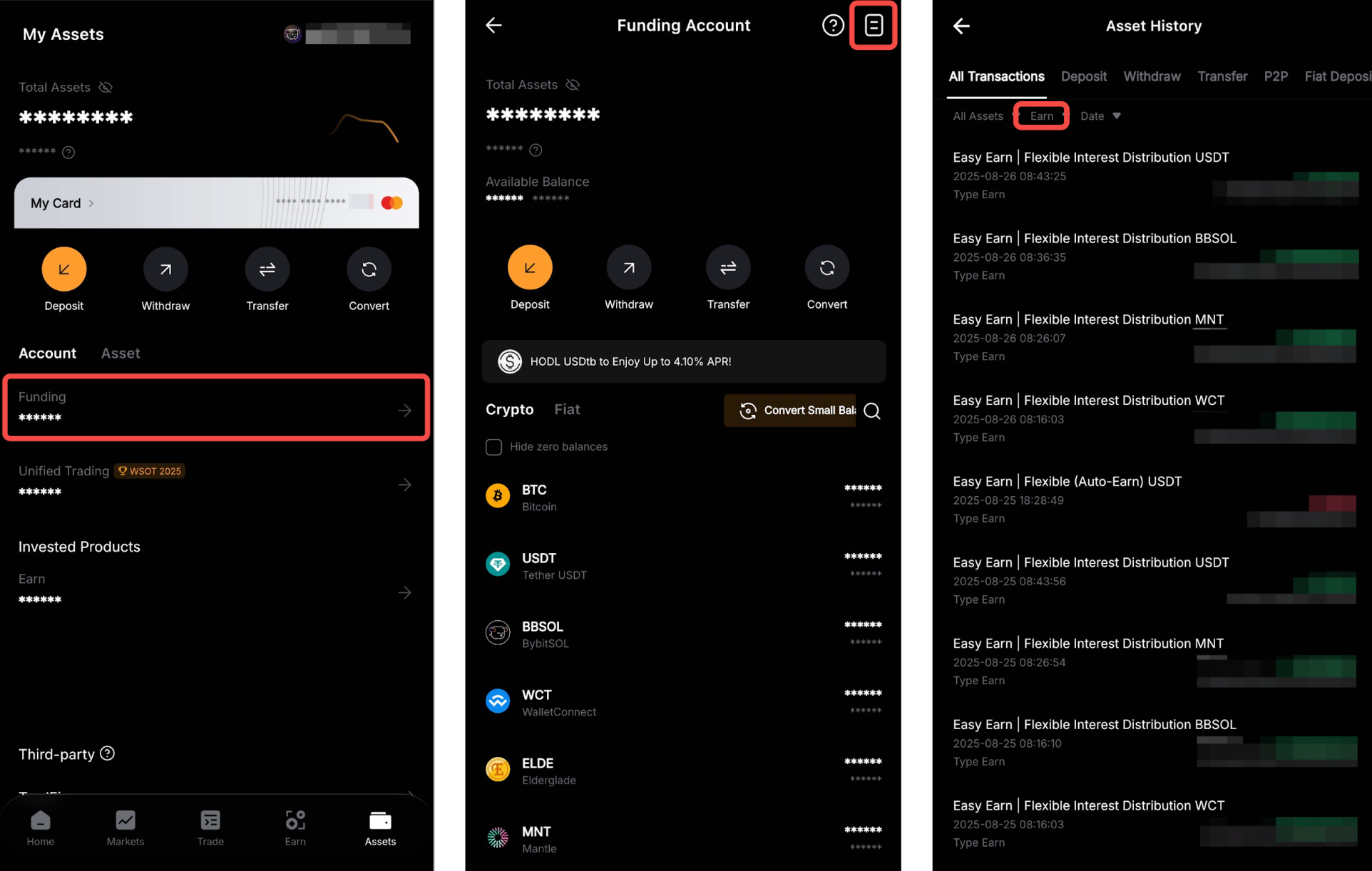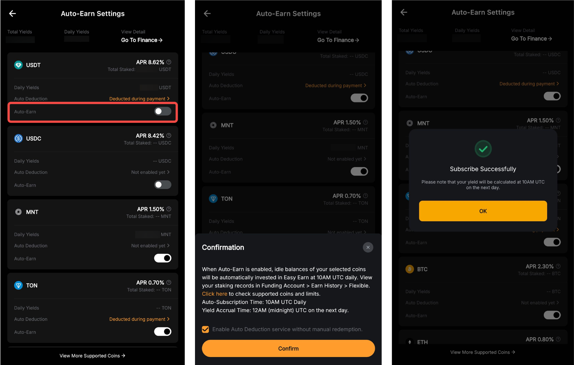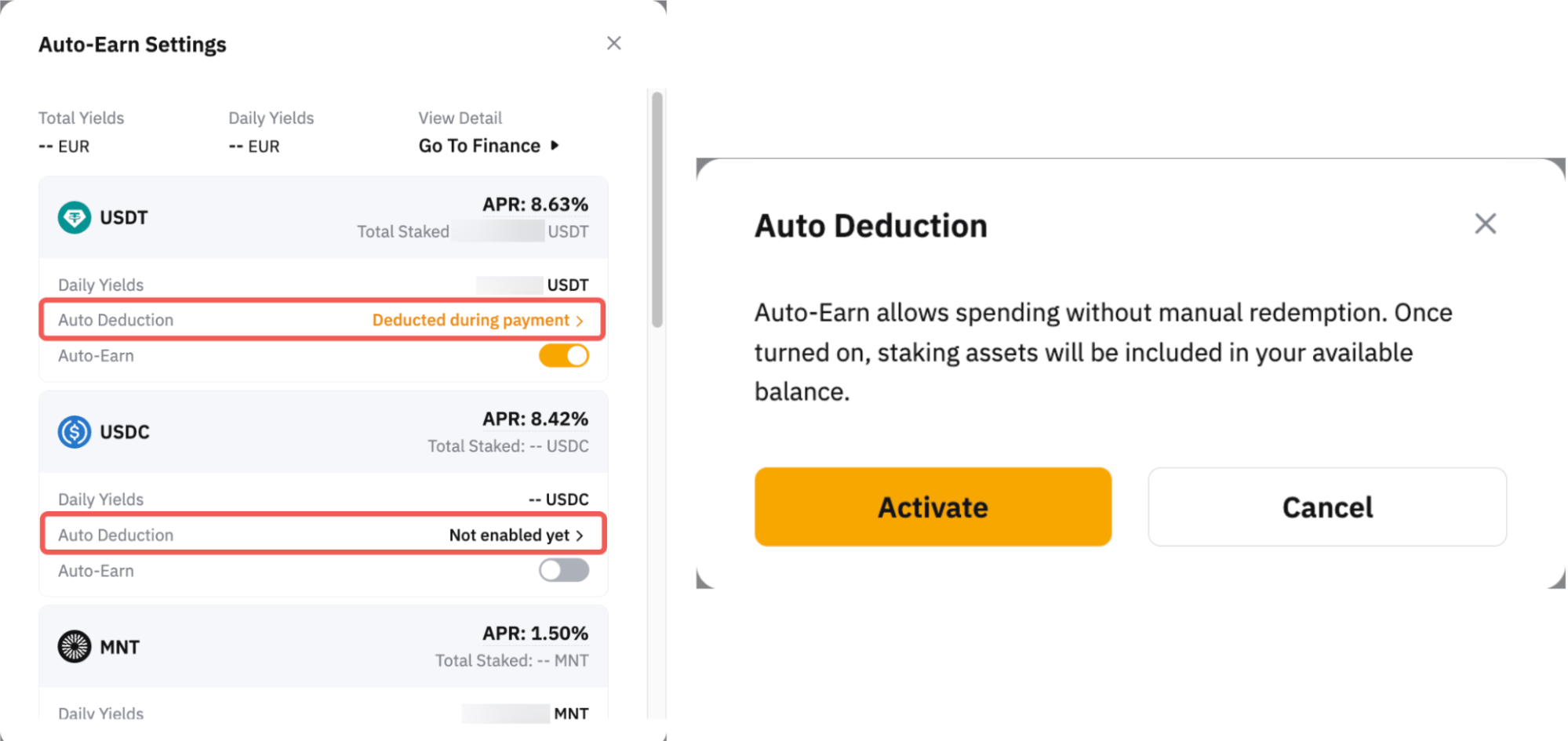 通过启用“自动理财”按钮,您的资金账户中的支付加密资产(每种货币上显示)的可转让余额将在第二天自动订阅灵活期限计划。