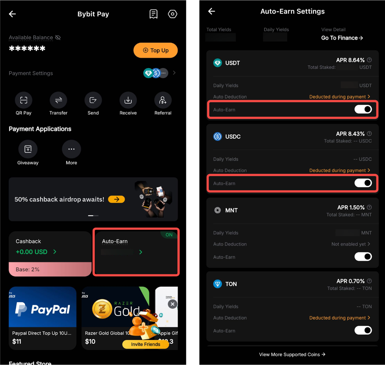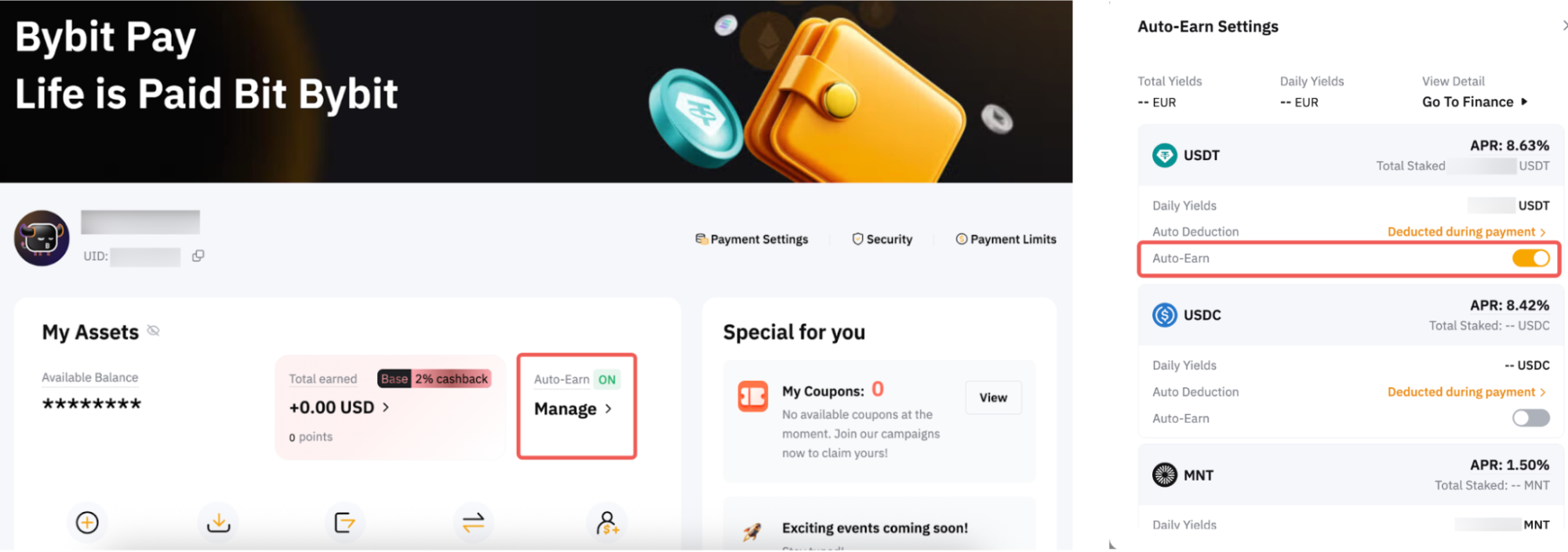 第 2 步:在“Bybit Pay”资产页面上,找到“自动理财”开关按钮,然后将其打开。
