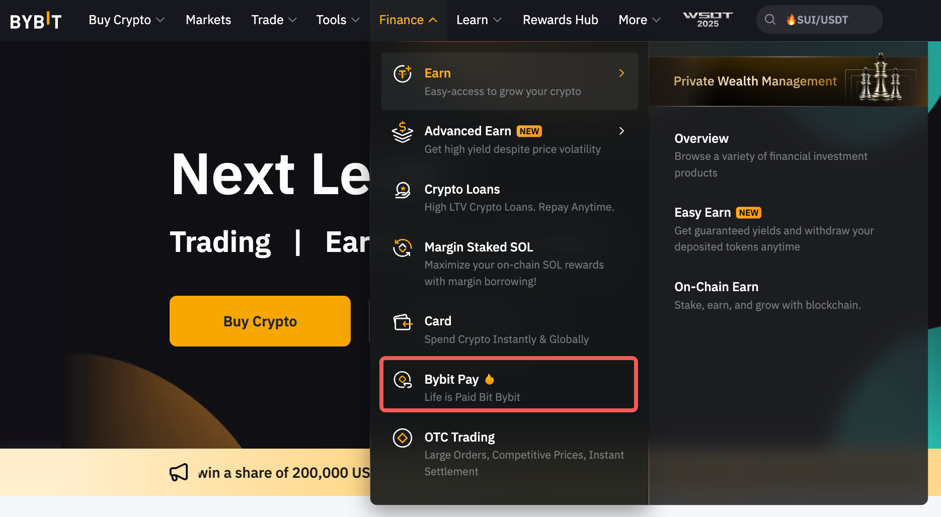 第 1 步: 单击“Bybit”页面上导航栏左上角的“金融”,然后选择“Bybit Pay”进入“Bybit Pay”页面。