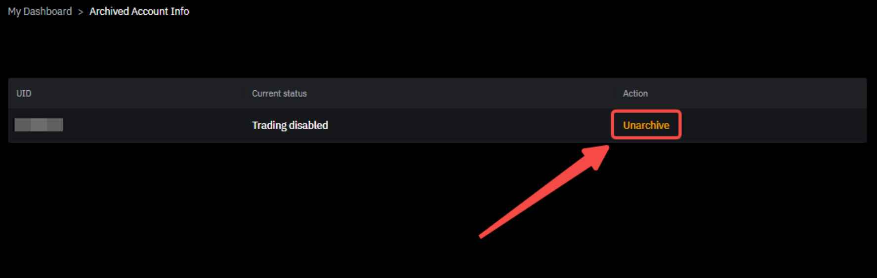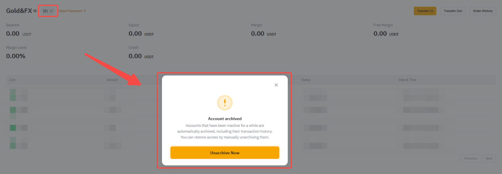 前往 Bybit MT5 资产页面。系统将显示一条弹出消息,通知您账户已存档。要解锁账户,请点击立即解锁按钮。