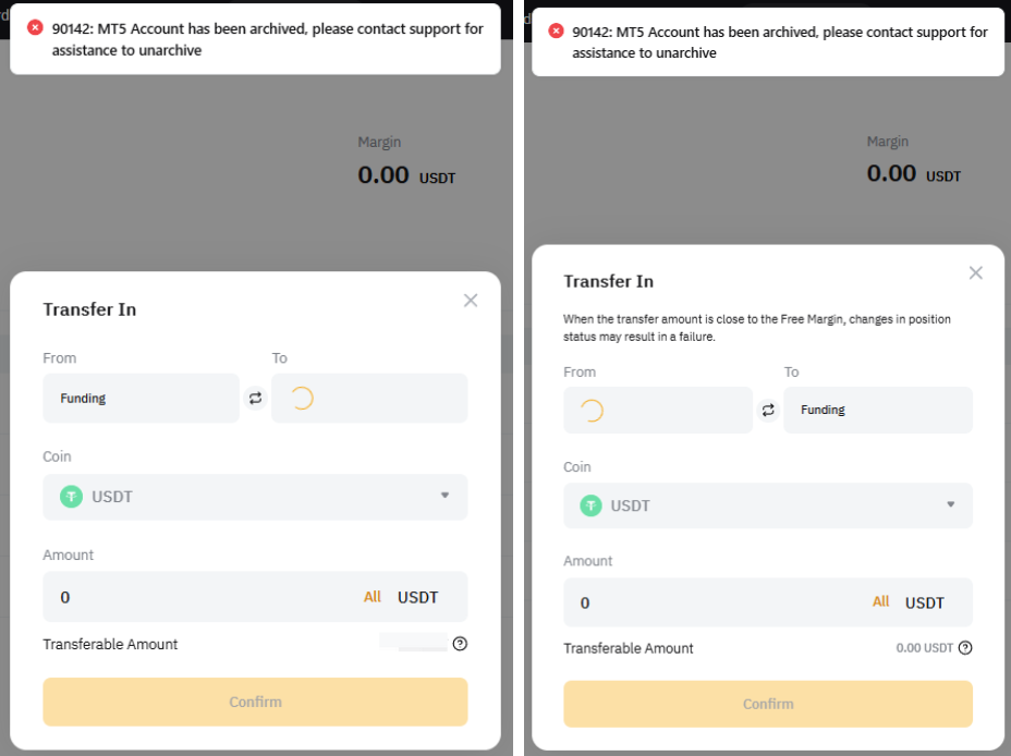 3. 尝试将资金转入和转入 MT5 账户时,您会看到一条错误消息。