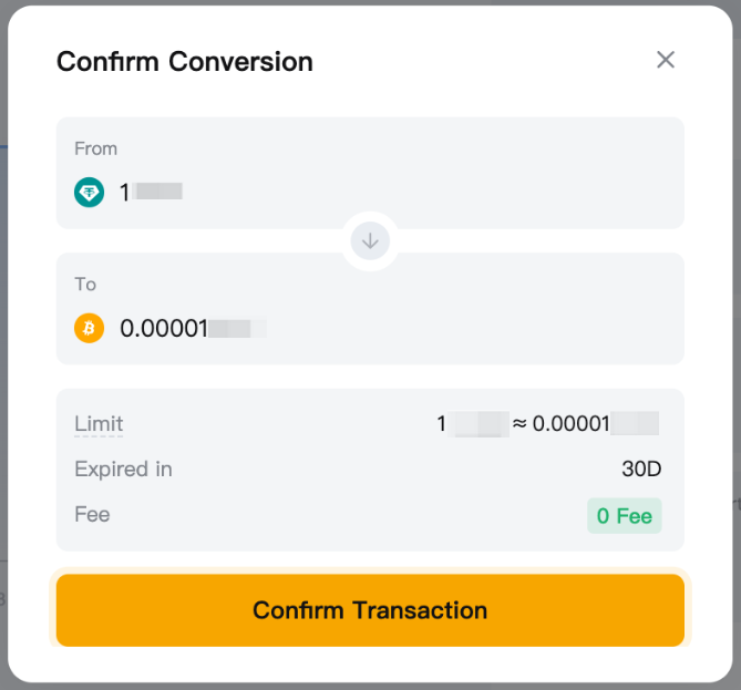 查看详情,如果您对价格感到满意,请点击确认交易。交易将立即执行,转换后的资产将存入所选账户。