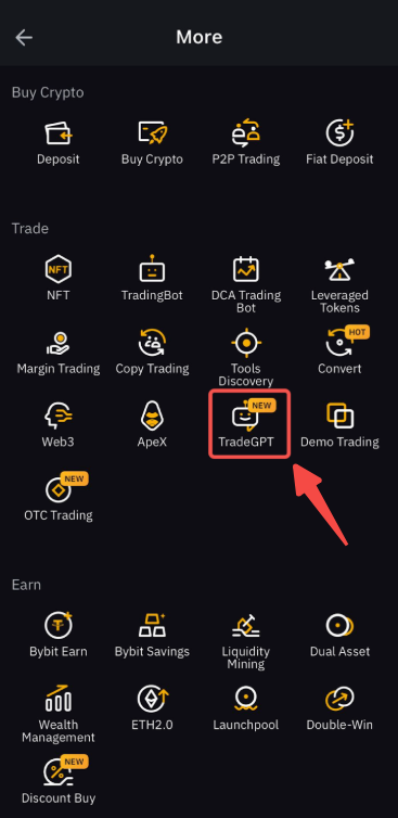 在 Bybit App 端,点击 Bybit 首页上的更多并选择 TradeGPT 即可访问 TradeGPT。