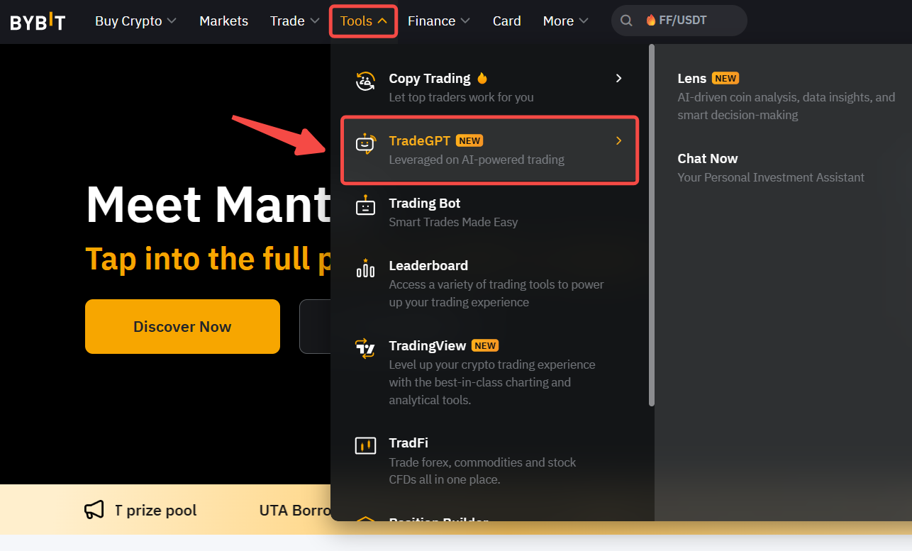 在 Bybit 网页端,只需点击此链接或在 Bybit 页面导航栏中点击工具,然后选择 TradeGPT 即可。