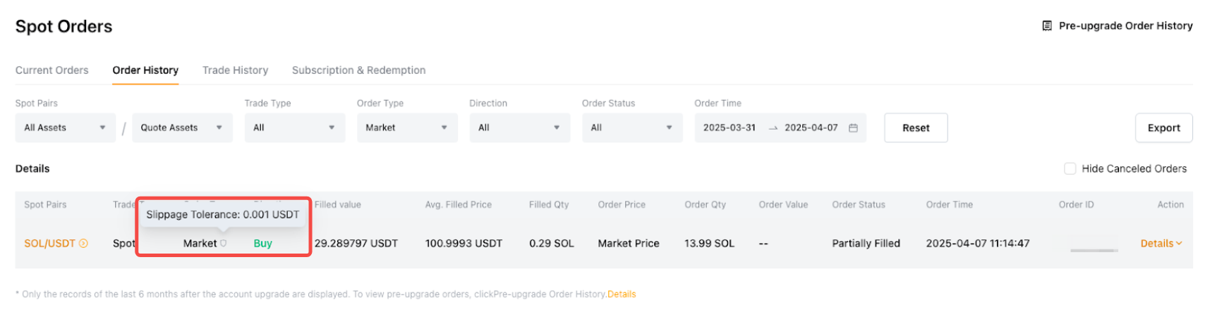 前往交易页面,选择底部的订单历史。将鼠标悬停在订单上,即可查看其滑点容差。