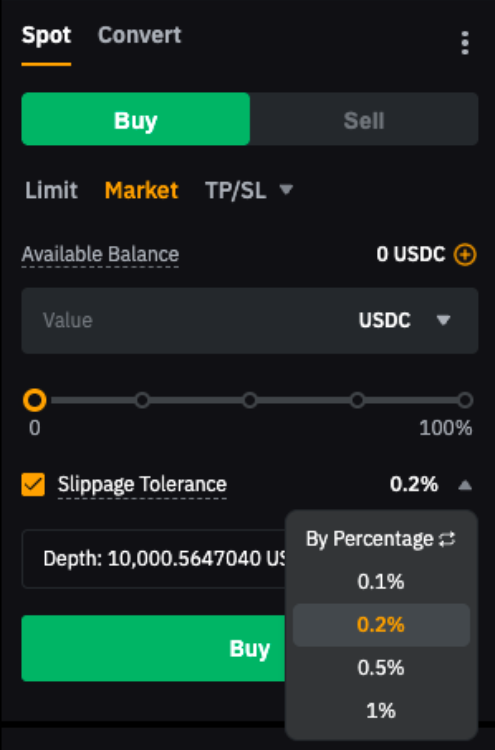 启用滑点容差后,仅当价格处于预设滑点范围内时,您的市价单才会执行,运作方式类似于限价单。您可以 按价差或百分比设置滑点容差。