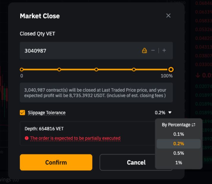 — 对于合约交易,您还可以针对市价全平启用滑点容差,并设置滑点百分比或价差(此步骤与下单操作相同)。