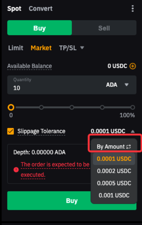 — 实际执行情况视订单规模和市场深度而定,因此无法保证订单全部成交。如果市场深度不足以让您的订单全部成交,则滑点容差范围内的部分将被执行,而滑点容差范围外的部分将被取消。