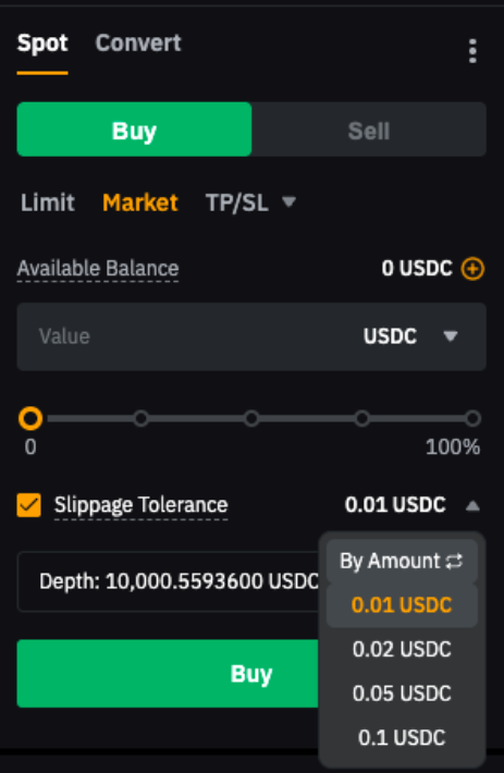 交易市价单时,您可以按价差或按百分比设置“滑点容差”,以此来控制您愿意接受的价差上限。这将确保您的订单仅在预期价格范围内执行,可提高交易的可预测性和效率。目前现货交易、现货杠杆交易和合约交易均支持滑点容差功能。